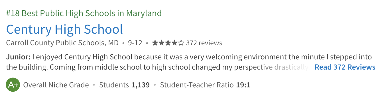 Ranking #18 in Maryland and #1 in Carroll County is Century High School: https://www.niche.com/k12/century-high-school-sykesville-md/