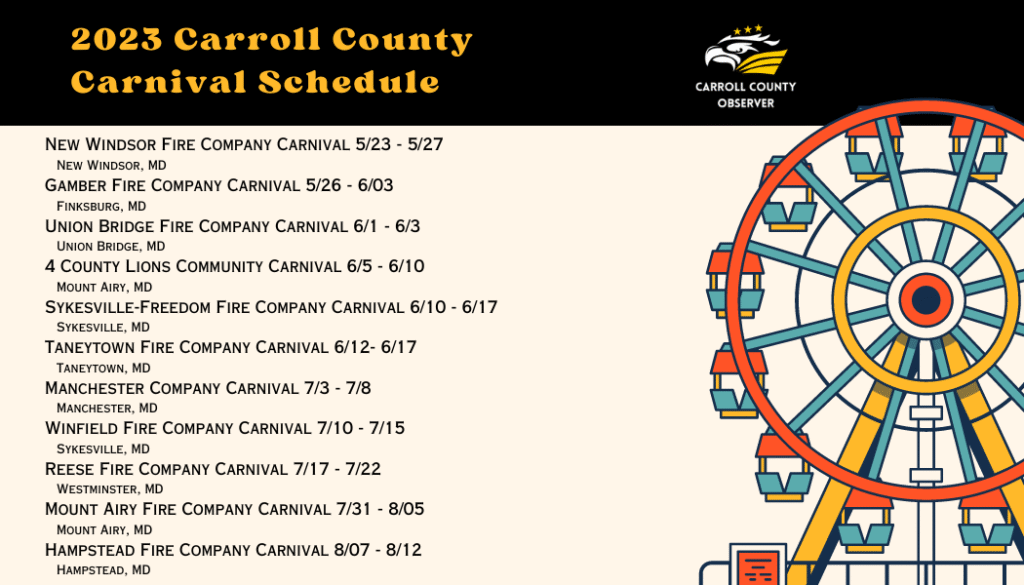 It is getting to be that time of year again….Local Carnival Season for Carroll County residents. I know first hand how difficult it can be to keep up with which local carnivals are coming up so I was thrilled to see a graphic online with a schedule.