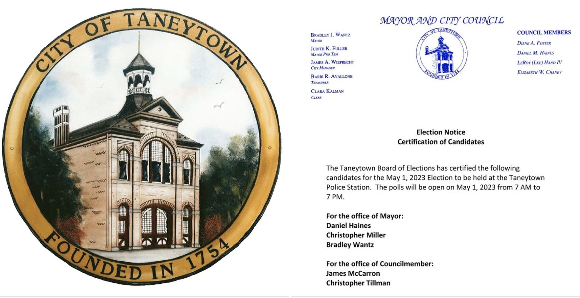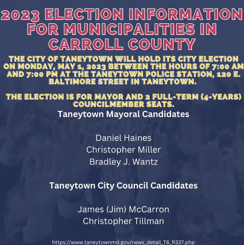The City of Taneytown will hold its City Election on Monday, May 1, 2023 between the hours of 7:00 AM and 7:00 PM at the Taneytown Police Station, 120 E. Baltimore Street in Taneytown. The election is for Mayor and 2 full-term (4-years) Councilmember seats.