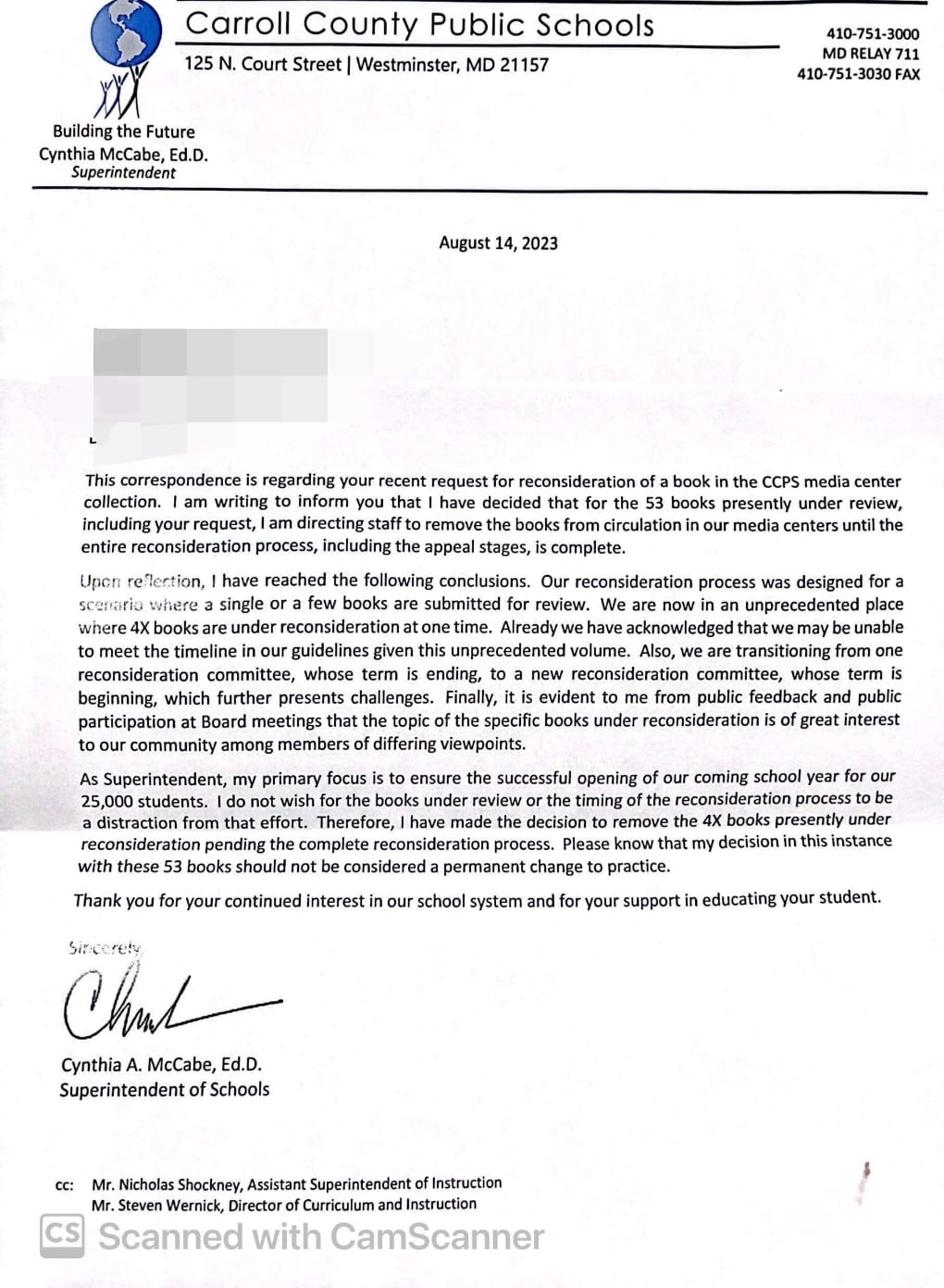In recent correspondence from Carroll County Public Schools Superintendent Cynthia McCabe (dated August 14th) relating to the 53 books that have been submitted for reconsideration within the CCPS system:
