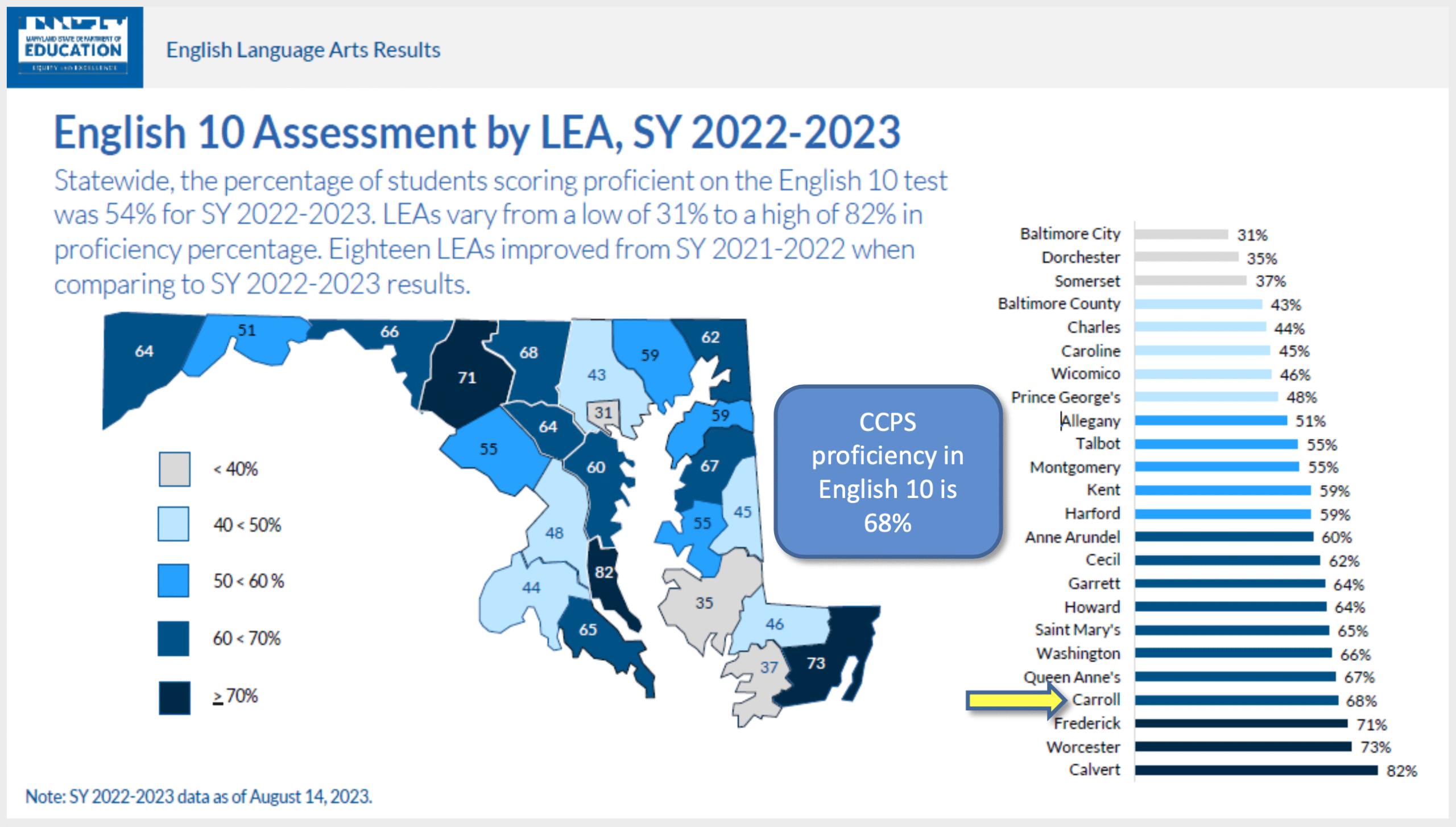 English 10 Assessment by LEA, SY 2022-2023: CCPS proficiency in English 10 is 68%