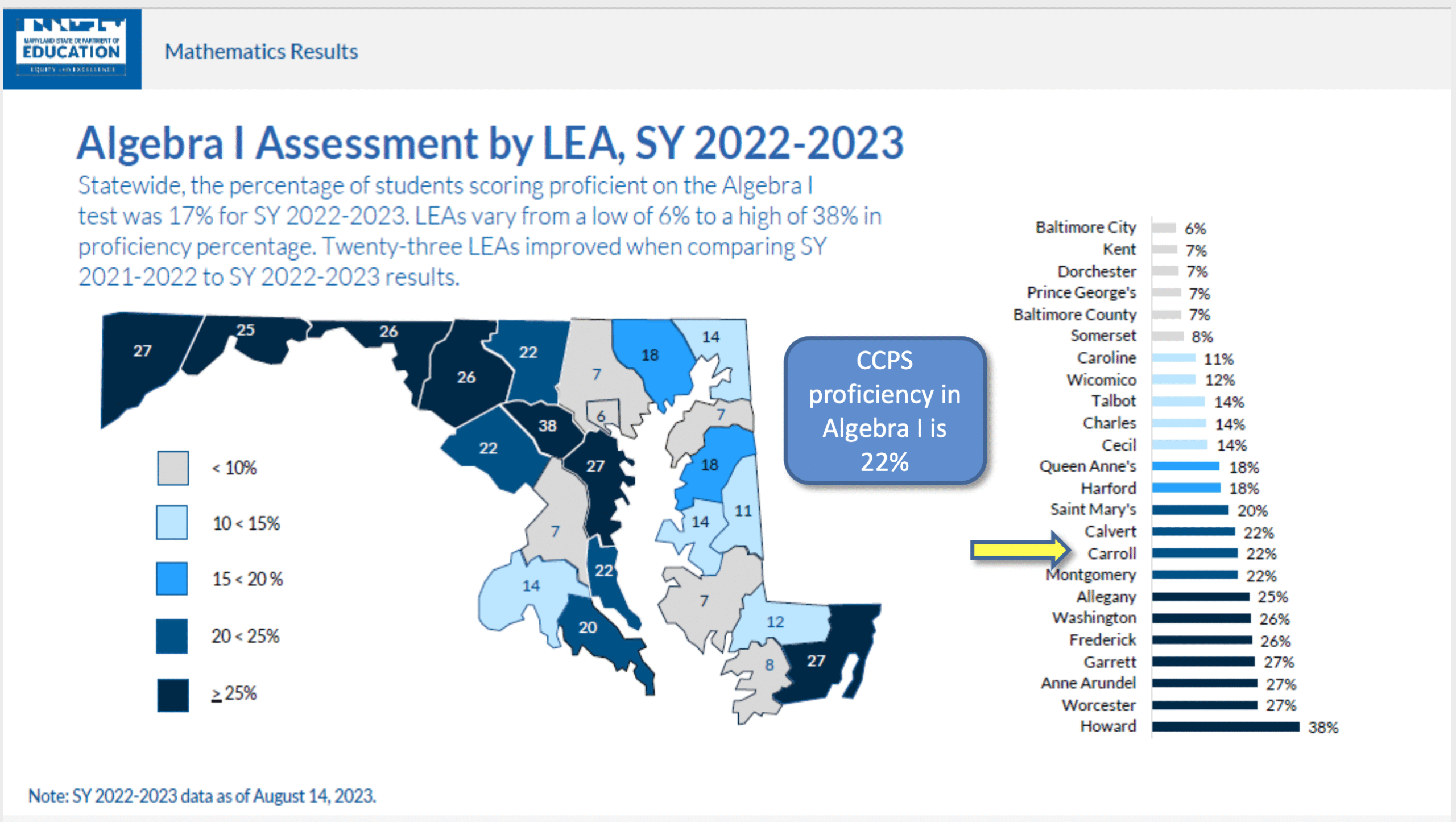 Algebra I Assessment by LEA, SY 2022-2023: CCPS proficiency in Algebra I is 22%