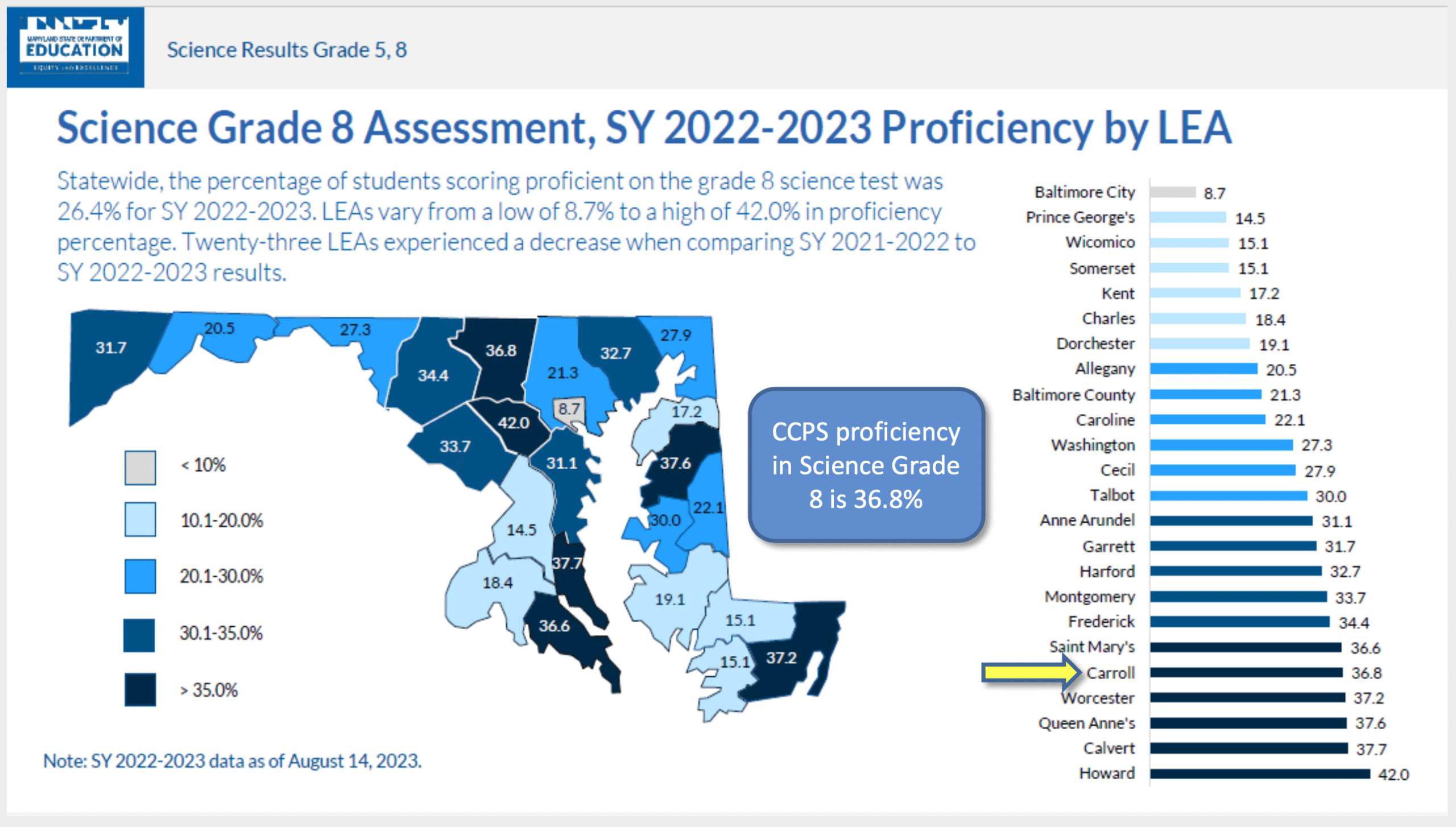 Science Grade 8 Assessment, SY 2022-2023 Proficiency by LEA: CCPS proficiency in Science Grade 8 is 36.8%