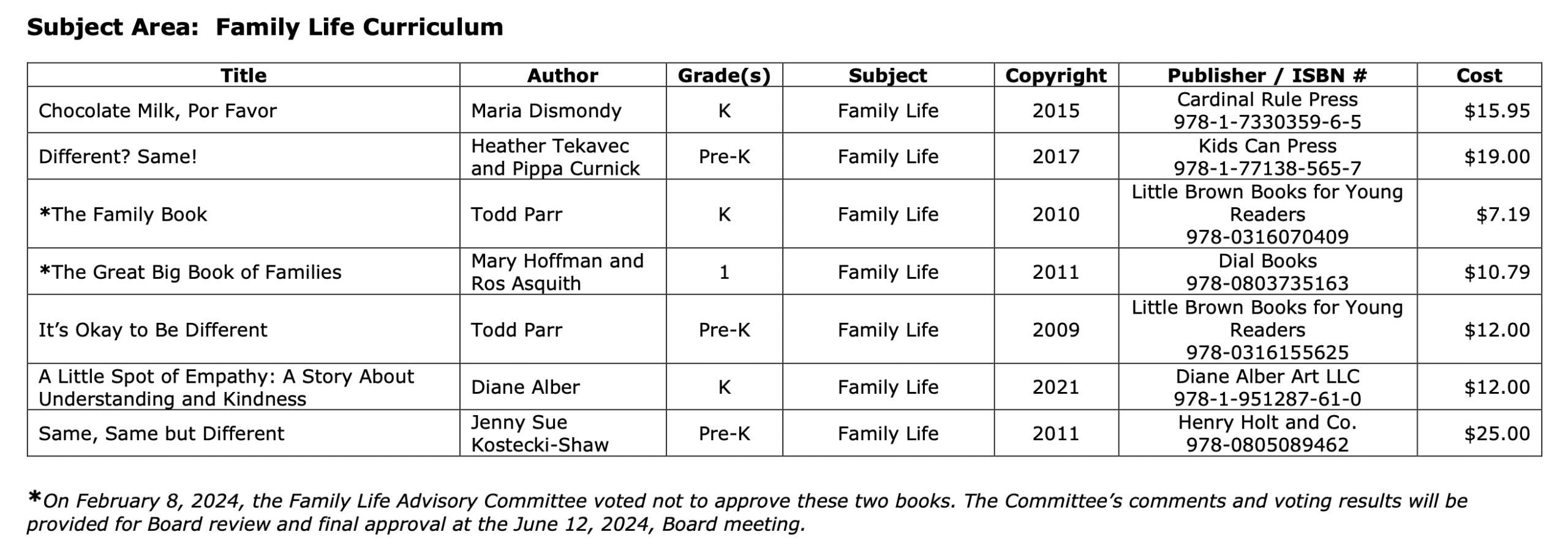 On February 8, 2024, the Family Life Advisory Committee voted not to approve these two books. The Committee’s comments and voting results will be provided for Board review and final approval at the June 12, 2024, Board meeting.
