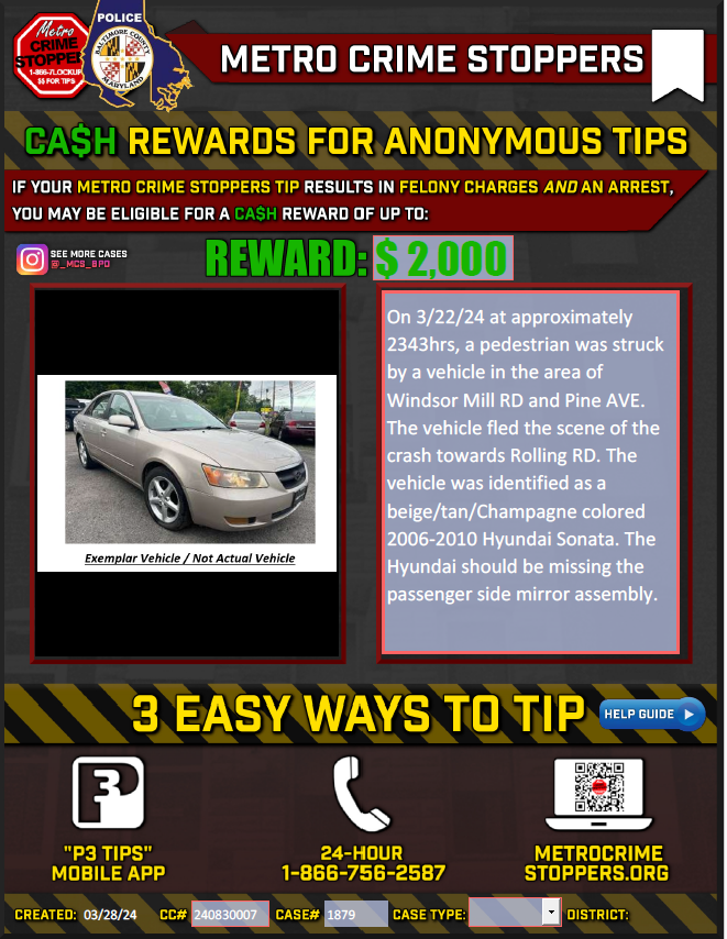 The incident occurred on Windsor Mill Road near Pine Avenue, 21244. The vehicle involved is described as a beige Hyundai Sonata, manufactured between 2006 and 2010. It fled the scene by heading westbound along Windsor Mill Road towards Rolling Road.